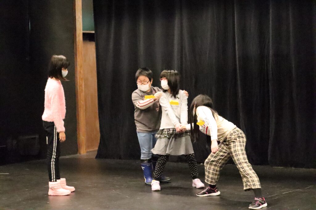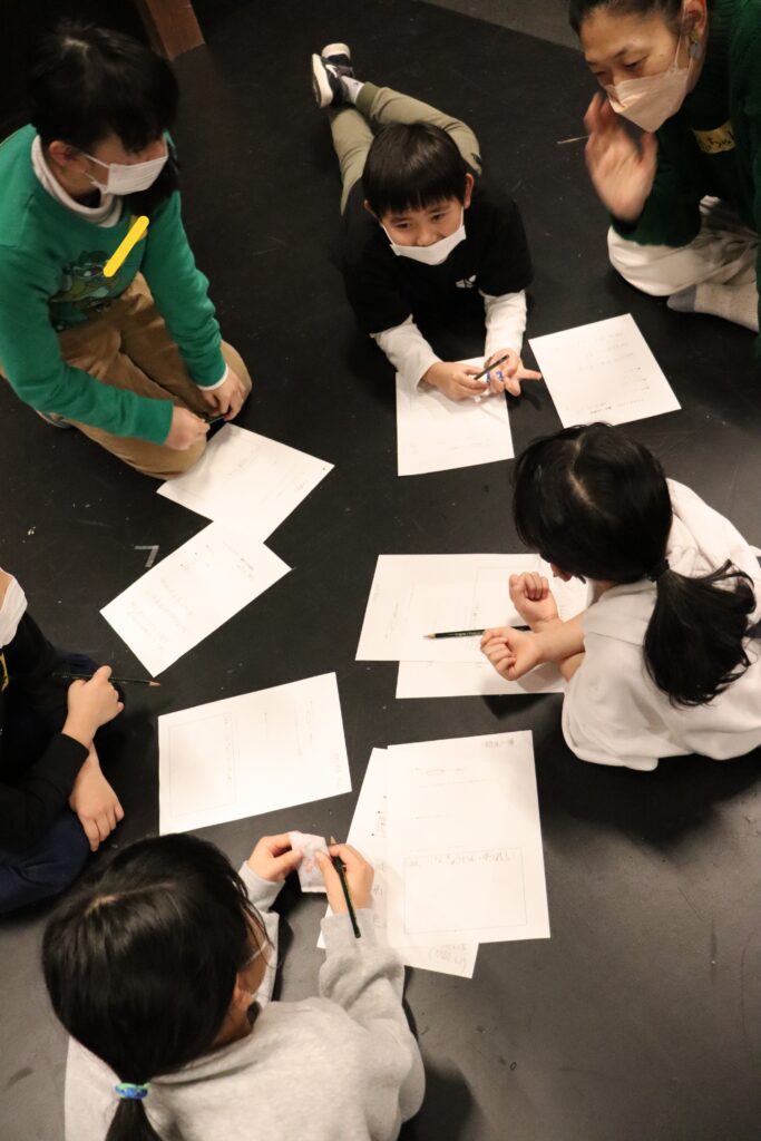 テンションも一気に上がったところで、講師の“ゆたっちょ”から、活動最終回の「発表会」に向け、どういうふうに劇を作っていくかの説明がありました。その後、3チームに分かれてゼロから色んな意見をすり合わせます。より良い作品にするために試行錯誤したり、動いて練習する中でアドリブでさらに新しいアイデアを投入したりと、「発表会」に対して全く物おじする様子などなく、もはや当前のように着々と創作に取り組む姿がありました。(いやいや、それって改めてすごいことです!)これまで、みんなで劇創作を何度も重ねてきた経験が発揮されています!