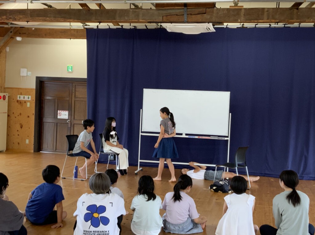後半の、チームでの創作では、「場所」と物語に登場する「やりたい役」を出し合い、物語を考え、みんなの前で発表をしました。4チームに分かれて、それぞれ「お墓」や「学校」「天国」「神様の家」といったような様々な場所で、みんなが考えた「やりたい役」が登場し、物語が繰り広げられていました。