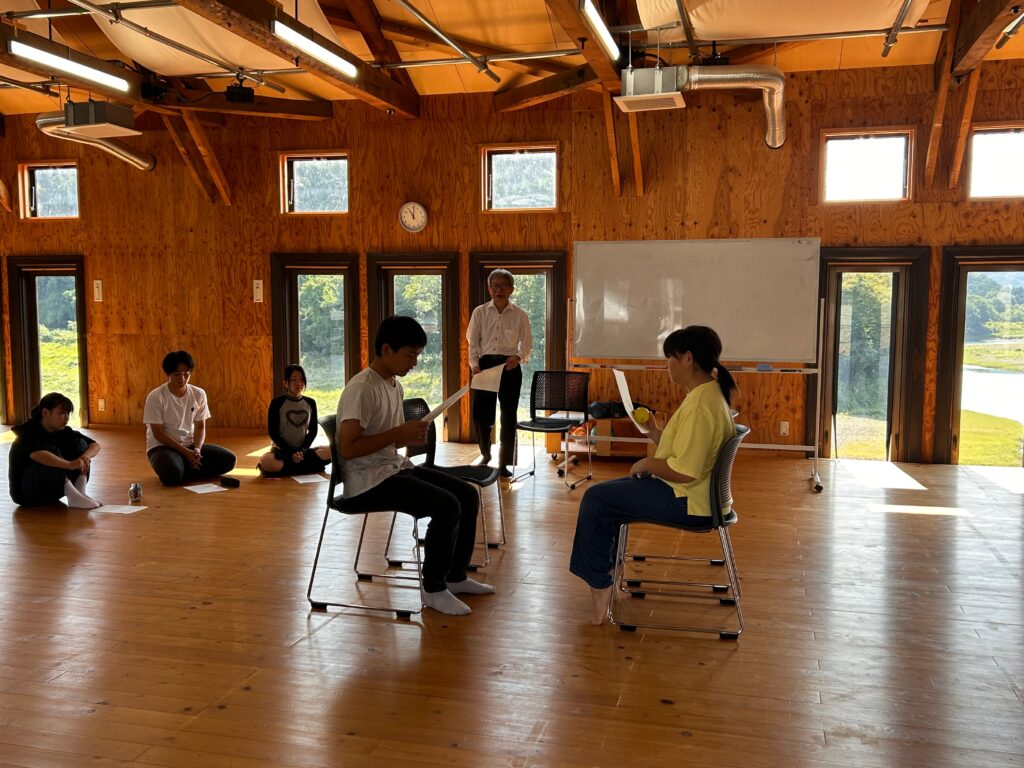 電車の中で相席になった人に話しかける「ご旅行ですか」というセリフを題材に、チームに分かれて取り組みました。